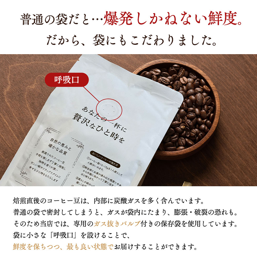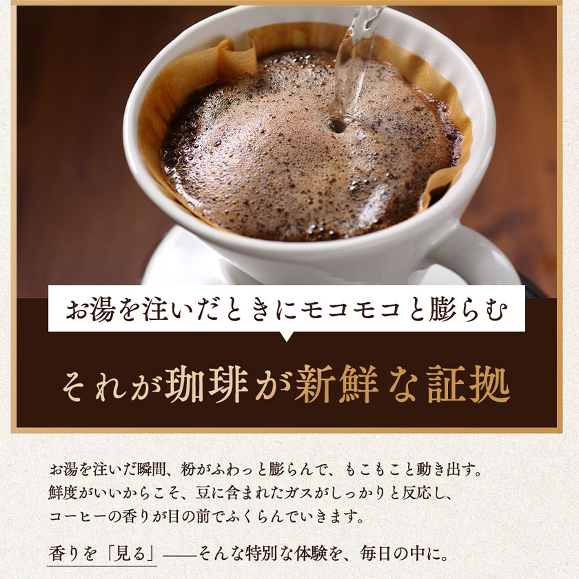 一杯のしあわせを、あなたの毎日に。自家焙煎によるオリジナルブレンド。焙煎したての豆をすぐにお届けするから、袋を開けた瞬間にふわっと広がる香り。鮮度と香ばしさの「ちょうどいいタイミング」を大切にしています。苦みと酸味のバランスがよく、コクや香ばしさが感じられる焙煎度。